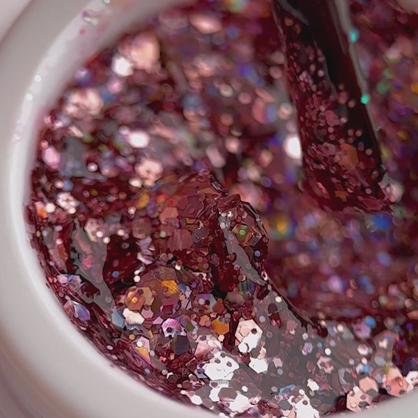 Cinderella Color Gel wypełniony jest opalizującymi drobinami o różnej wielkości i kształcie, w tym heksagonalnymi płatkami, które przepięknie odbijają światło, tworząc wielowymiarowy efekt tafli.