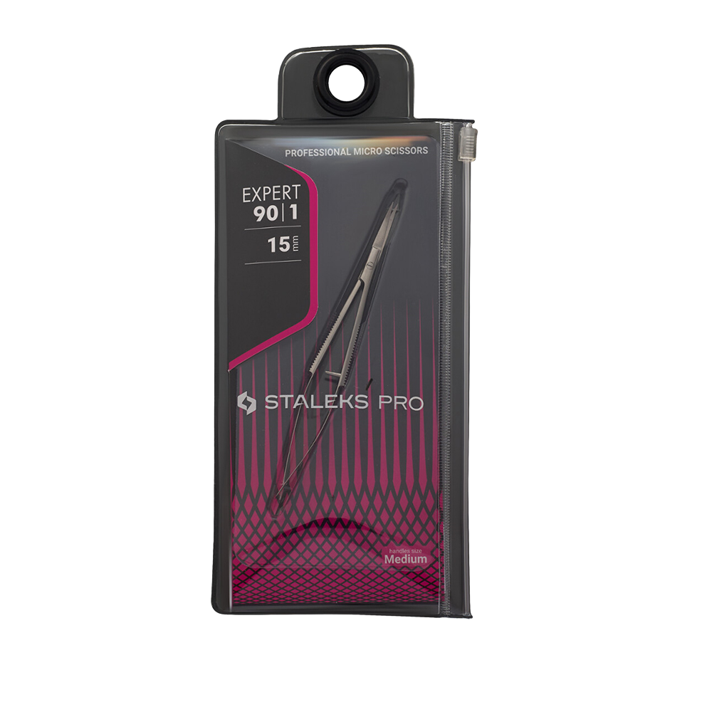 Mikronożyczki STALEKS PRO Expert 90 - to profesjonalne narzędzie dla stylistów przeznaczone do wycinania skórek oraz przy stylizacji brwi i rzęs. Całkowita długość nożyczek wynosi 125 mm. Długość ostrzy roboczych wynosi 15 mm, szerokość ostrzy 3 mm. Dzięki swojemu wygodnemu uchwytowi o nietypowym kształcie oraz spiczastych, zakrzywionych ostrzach mikronożyczki zapewniają wyjątkowo precyzyjny dostęp do ciętego materiału w najbardziej niedostępnych miejscach.