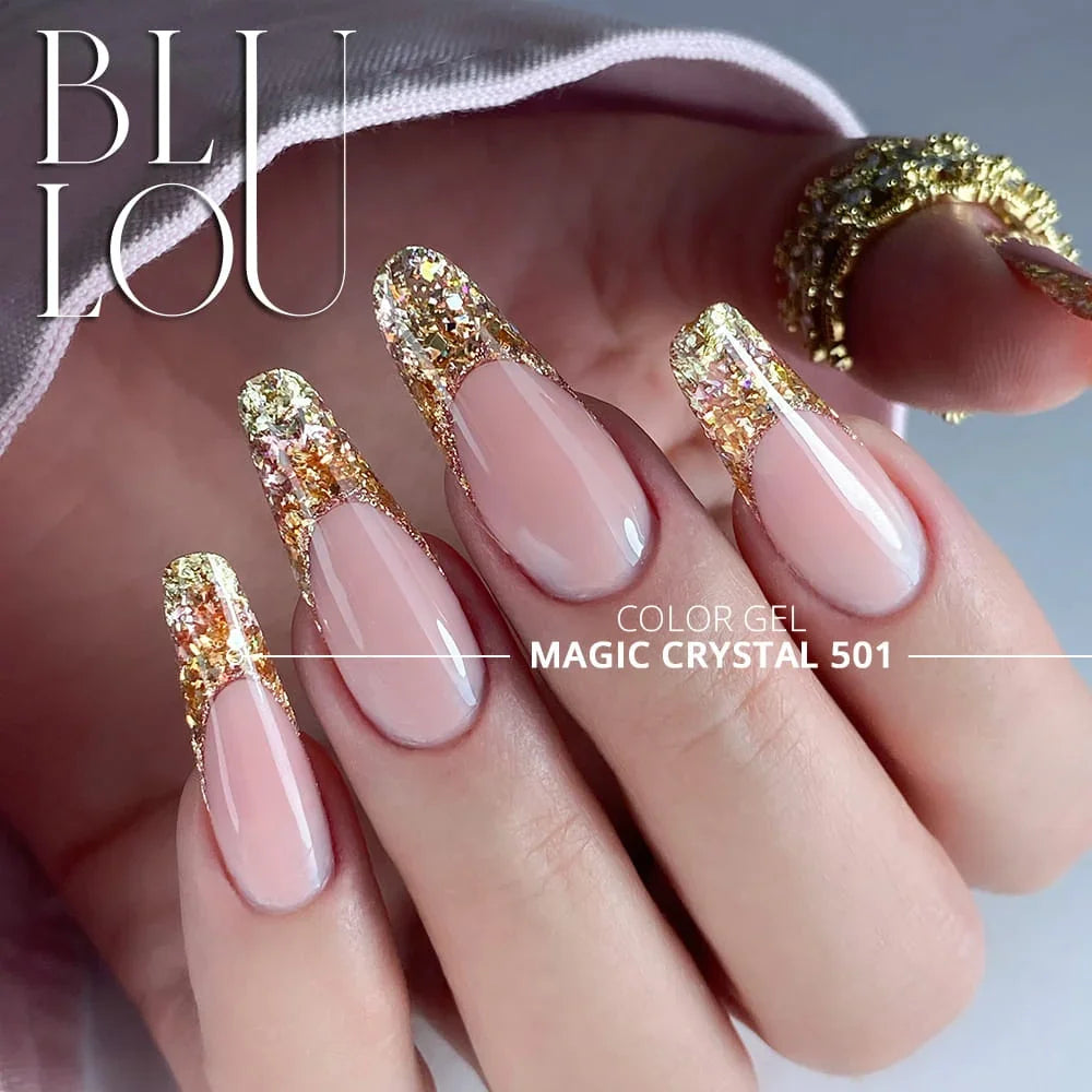 Gelovi dostupni u raznim bojama i oblicima omogućuju vam stvaranje raznih uzoraka i efekata - zato BluLou nudi Princezini nokti s heksagonalnim česticama i Čarobni kristal s ostacima folije, a svaki gel ima čak 10 varijanti boja!