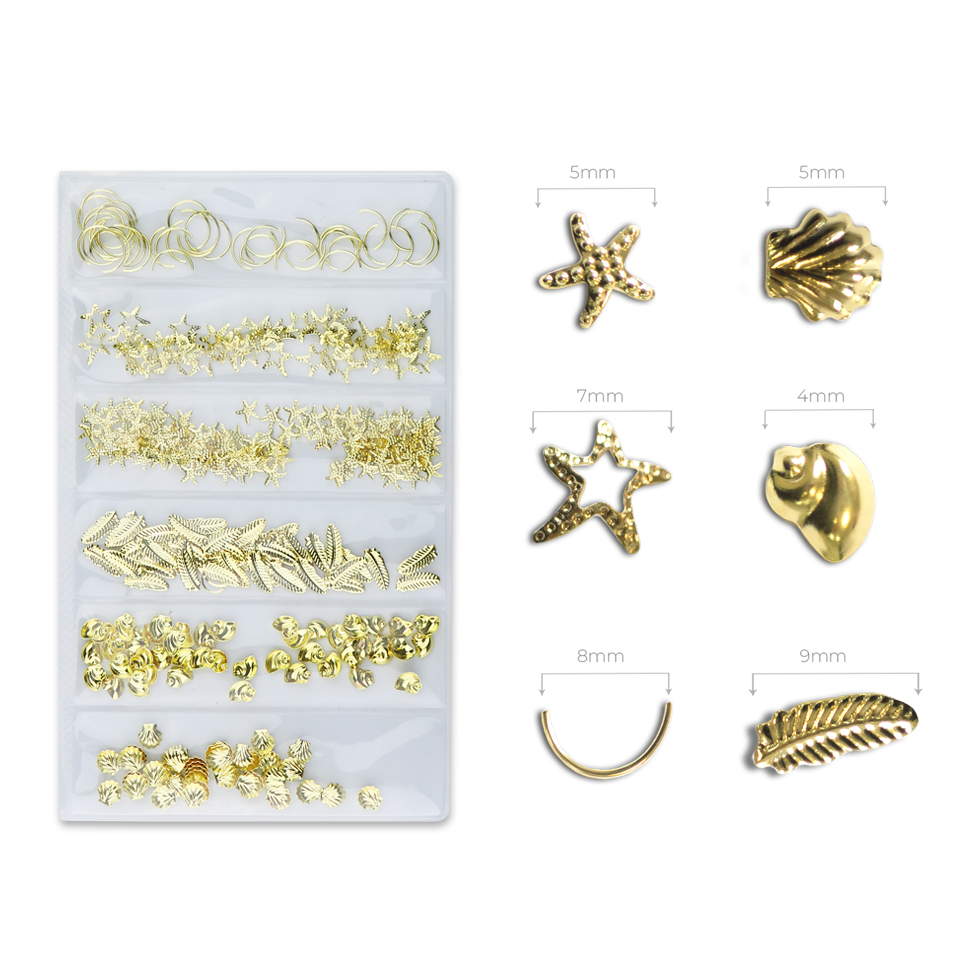 • Gold MIX 01 – gouden plaatjes in 6 vormen, m.in. schelpen, sterretjes, veertjes en halve cirkels.
