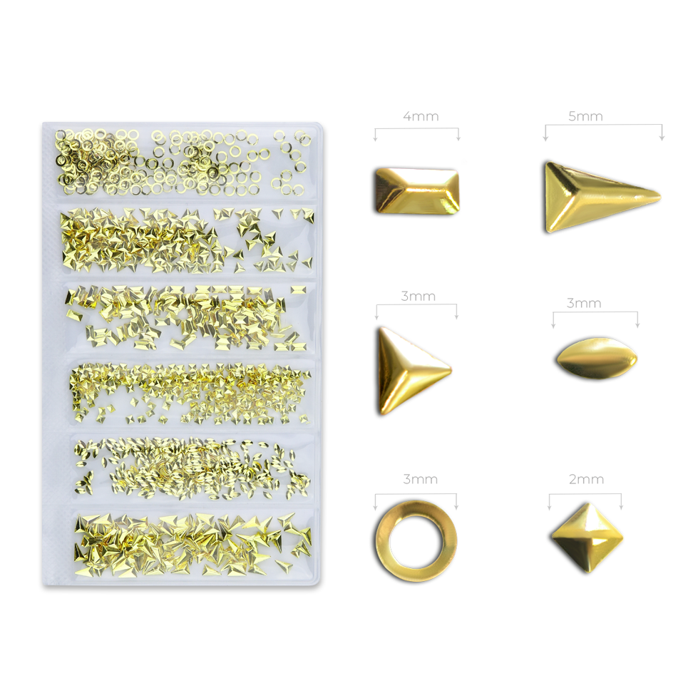 Ontdek de Decoratieve Plaatjes – opvallende, metallic studs in verschillende vormen en kleuren, waarmee je eenvoudig originele, sierlijke nagelstyling kunt creëren. Dit is een snelle manier om je manicure een unieke uitstraling en luxe afwerking te geven — zonder de noodzaak voor ingewikkelde versieringen.