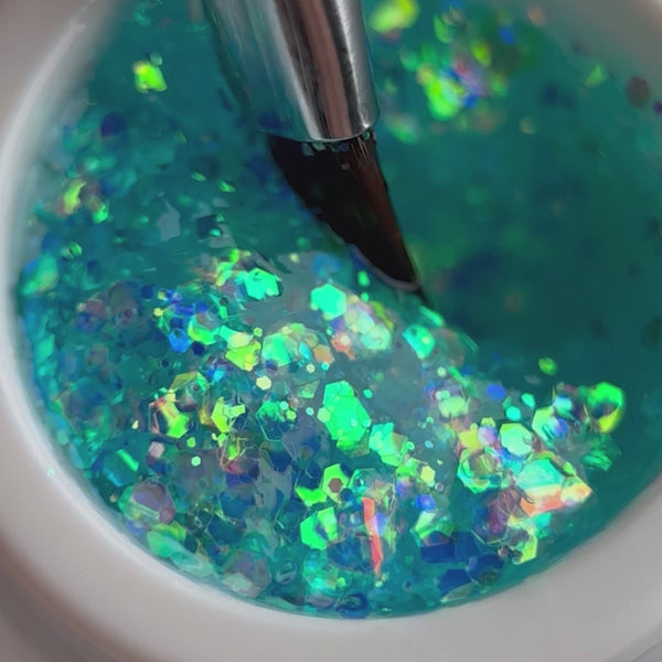 Cinderella Color Gel wypełniony jest opalizującymi drobinami o różnej wielkości i kształcie, w tym heksagonalnymi płatkami, które przepięknie odbijają światło, tworząc wielowymiarowy efekt tafli.